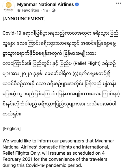 另外,由于春节因素,国航、东航和南航在2月未安排仰光与中国之间的航班,但是缅航则将在仰光机场重启之后,于2月恢复每周一班飞往成都的航班。当地时间2月2日晚,缅甸仰光机场重新启动,通往多国航线复飞。机场重新启动之后,最先起飞的将是于2月3日凌晨飞往韩国和马来西亚的航班。