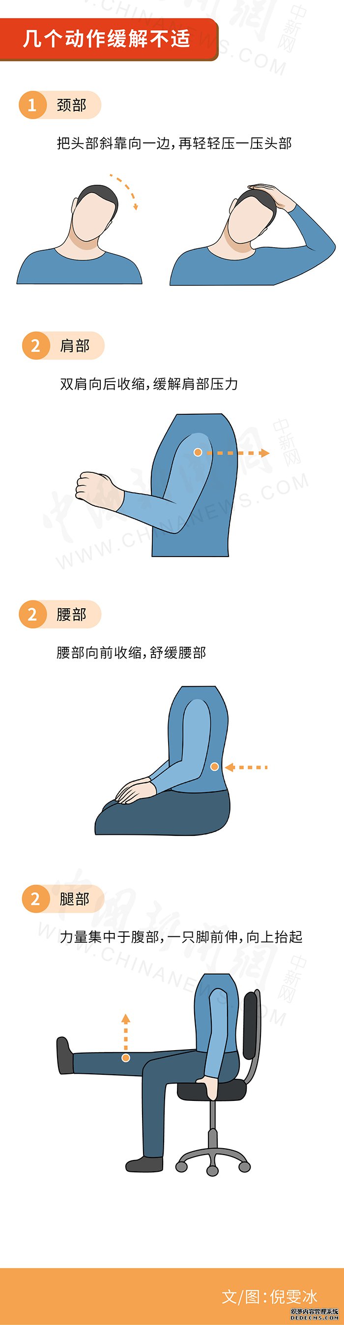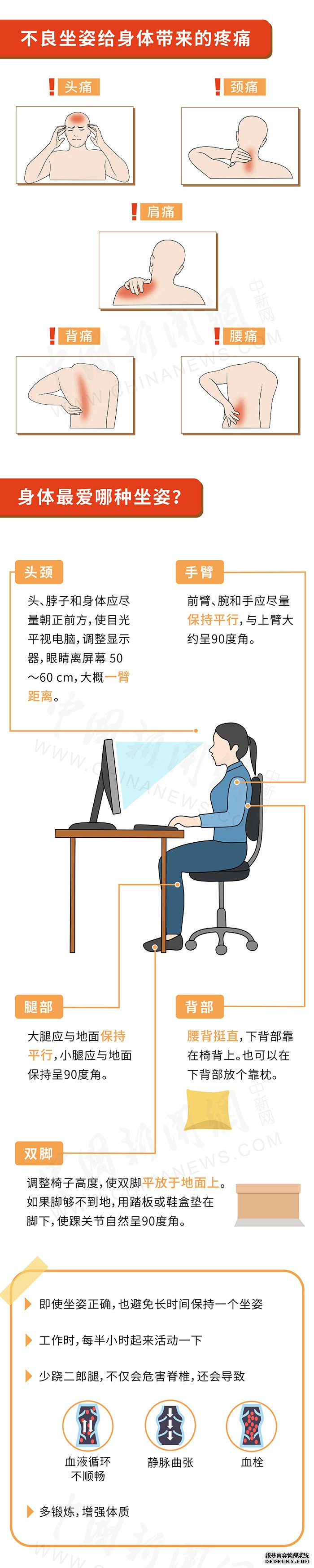 但即使是正确的坐姿,也要避免长时间保持一个姿势,最好是每 30分钟就起来活动一下,进行几次牵伸或运动训练来缓解身体的不适。
