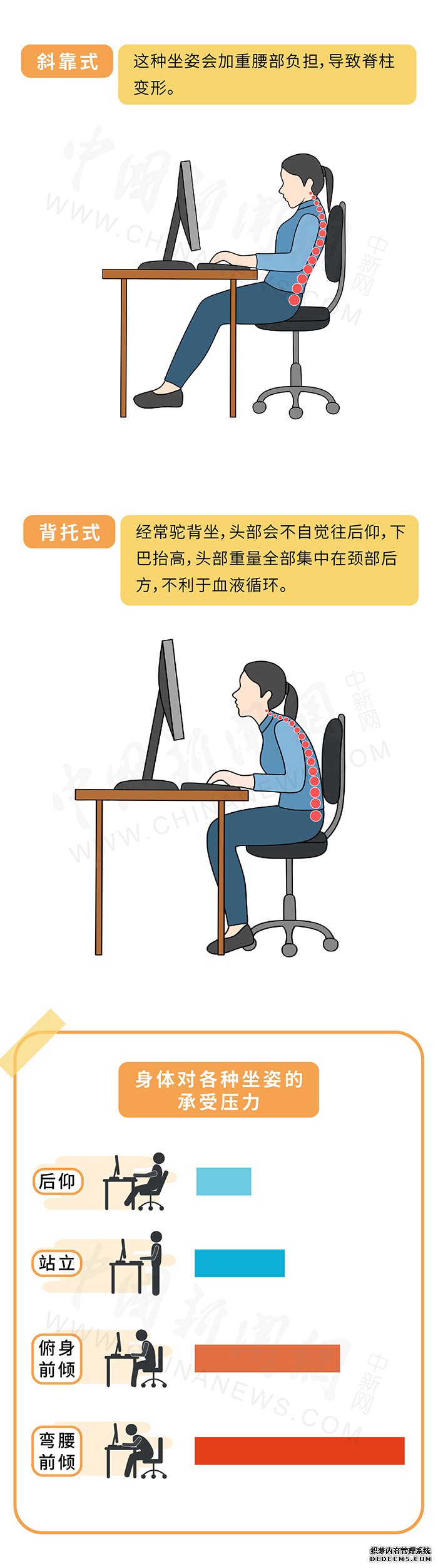 在工作时,可以选择一个无凹陷或无歪斜的椅子。有凹陷的椅子只会让你的背部陷得更低,而有歪斜的椅子会让你陷入一个奇怪的角度,从而误导你的坐姿。建议大家尽量坐在靠近椅子边缘的地方,这可以让你的坐骨拥有足够多的空间,来保持身体的平衡。