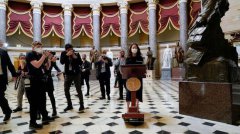 工作人员推着佩洛西的讲话台入场(美联社) 海外网1月14日电 综合美国广播公司(ABC)、法新社消息,当地时间13日晚,在众议院举行的弹劾投票表决仪式上,议长佩洛西的讲话台又回