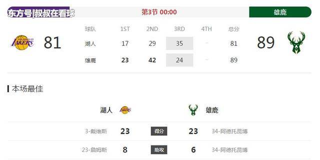 今天湖人和雄鹿比赛的第3节,上半场一度落后21分的湖人,在3节结束已经把分差追到了10分以内!81比89,只落后8分!