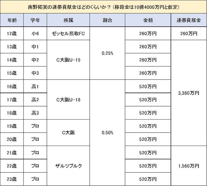 根据规定,在球员每一次转会当中,其培养过他(23岁以下)的俱乐部都将获得一笔青训补偿金。而在加盟利物浦前,南野拓实曾分别在熊取FC、大阪樱花、萨尔茨堡红牛效力。