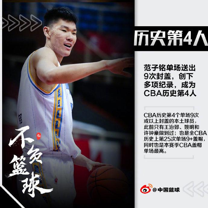 除了得分,范子铭在防守端给予球队的支持更大。本场比赛,范子铭完成了9次封盖,这不仅创造了个人CBA生涯的单场新高,甚至也成为近11年来本土球员的单场封盖纪录——之前是2009-2010赛季的许钟豪完成10次封盖。同时也是第四位单场9+次封盖的本土球员,此前只有姚明、王治郅和许钟豪做到过。