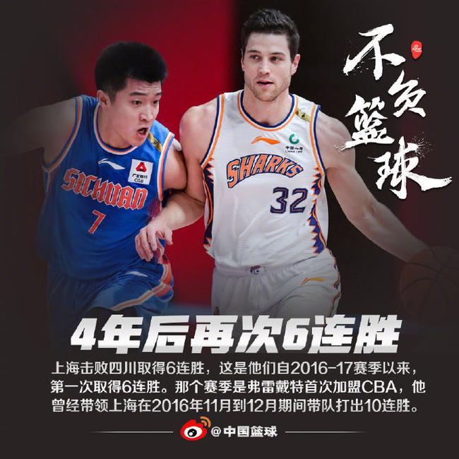 北京时间1月2日,CBA常规赛第26轮,上海122-102大胜四川,收获6连胜,这也是在2016-17赛季后,上海时隔4年,再度取得6连胜。
