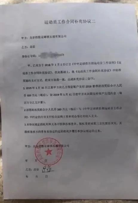 今年 1 月 2 日,吕征在社交媒体上晒出个人与北体大俱乐部签订的工资补充协议,控诉北体大拖欠自己工资一年多,“退役快一年了,旧账依然理不清。”按照他的说法,他是于2019 年 1 月 14 日随球队在广东佛山冬训时,与俱乐部签订了《补充协议 2 》。当初他向足协申请仲裁时,因为未能找到原件,北体大俱乐部矢口否认,足协仲裁庭也认定此事可等他有了新的证据再寻求其他途径解决。如今,他找到了原件,尽管俱乐部承认了这份补充协议的存在,但又辩解称至今未支付的 80 万元是因他 2018 赛季出场率不足50 %,而从补充协议里的助攻奖金中扣除的。对此,吕征表示,“ 2018 赛季,全年 30场,我出场 14 场,因伤病耽误六到七场,工作合同明确伤病按100%全勤。俱乐部首先认可我2018年完成出场率,才于 2019 年 1 月中旬全额发放了 2018 年度剩余工资,而且我们双方达成认可才签署的《补充协议 2 》,这份协议第二条明确了这笔助攻奖金与该支付给我的工资奖金无关。”