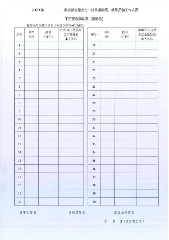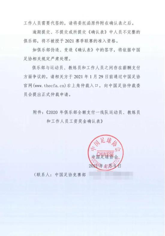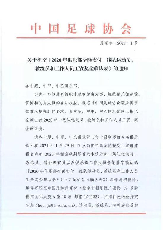 1 月 4 日,中国足协下发了《关于提交 2020 年俱乐部全额支付一线队运动员、教练员和工作人员工资奖金确认表的通知》,要求各中超、中甲、中乙俱乐部以及中冠前 4 名的俱乐部在 1 月 29 日 17 点之前上交工资奖金确认表。对于很多俱乐部来说,工资确认表是真正的 “年关” ,过了这一关,才能更加踏实地筹划下个赛季。