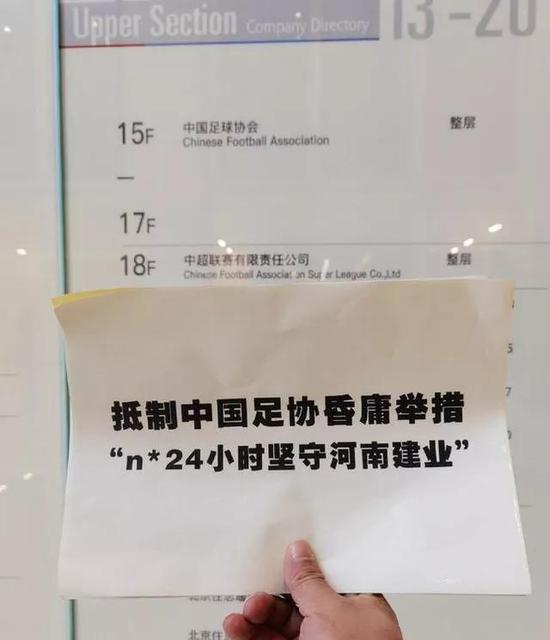 众所周知,中国足协对于俱乐部中性化更名一刀切的政策,在三级联赛中的确产生了一定的争议。尤其是使国安、泰达和建业等这些存在了二十年以上的俱乐部的球迷产生了巨大的情绪反弹。近日,河南建业拟更名为洛阳龙门的消息,更是让很多建业球迷难以接受,一些极端球迷还做出了不理智的举动。不想让自己支持的球队连 “姓” 都变了的建业球迷,最近几天一直在展开各种各样的抗议活动。河南球迷自制的 “抵制中国足协昏庸举措,n*24 小时坚守河南建业” 的标语,甚至出现在了中国足协所在的办公楼里。