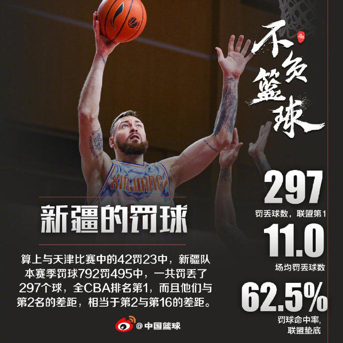 本场比赛,新疆男篮在罚球线上仅仅交出42罚23中的表现,而算上本场比赛罚丢的19个罚球,新疆男篮本赛季已经罚丢了297个罚球(792罚495中),高居联盟罚丢次数榜的第一位,而且他们62.9%的罚球命中率同样排名联盟倒数第一。
