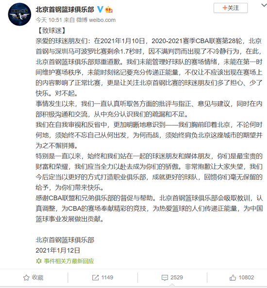 北京时间1月12日,北京首钢官方发布致歉声明:我们未能管理好球队的赛场情绪,未能在第一时间维护赛场秩序,未能时刻铭记要充分传递正能量。非常抱歉让大家失望,我们今后定当以更好的方式打造职业俱乐部,成就更好的球队。