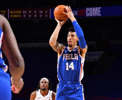 昨天76人对阵老鹰,丹尼-格林全场9投0中,三分球7投0中,只依靠罚球得到2分。