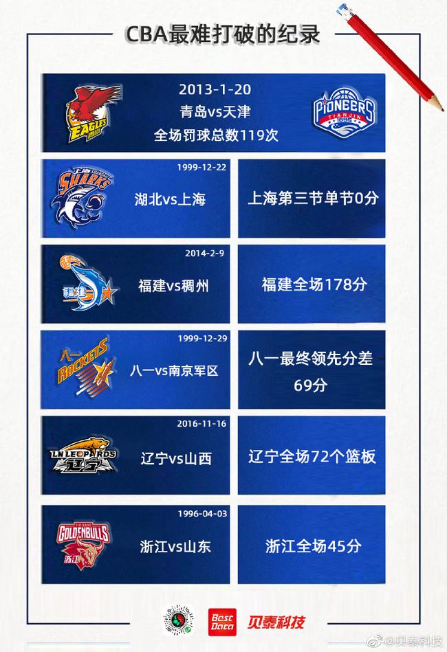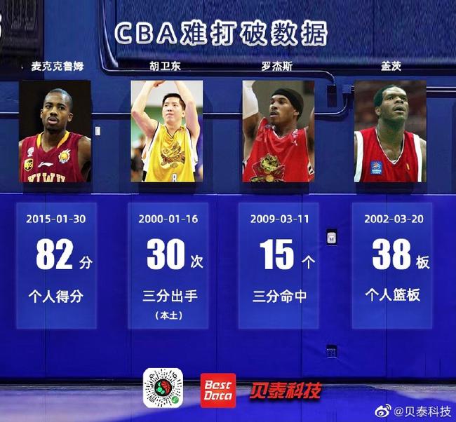 直播吧2月7日讯 CBA官方数据合作伙伴贝泰科技今日晒出一组“CBA最难打破的纪录”,其中包括麦克克鲁姆(NBA开拓者球员CJ的哥哥)单场82分、盖茨单场38个篮板等球员纪录,也有“上海单节0分”、“浙江全场45分”等等球队纪录。