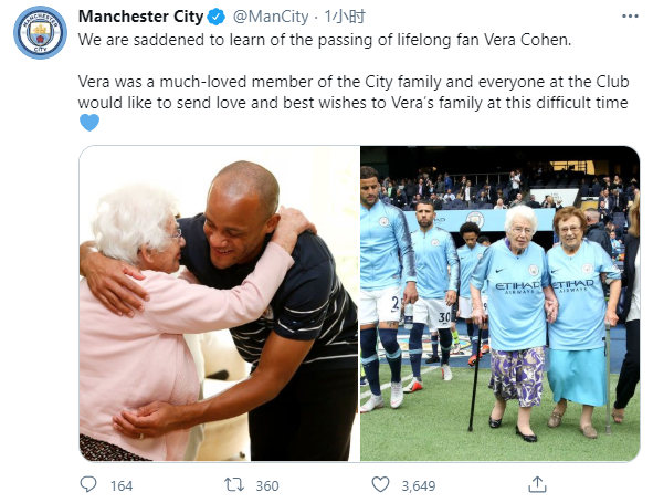 “我们对曼城终生球迷Vera Cohen的去世深感悲痛,她一直都是曼城大家庭里深受爱戴的一员,在这个艰难的时刻,俱乐部的每一位员工都向Vera的家人送上爱和最美好的祝福。”曼城官方推特写道。