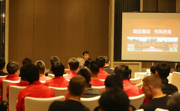 过去的一年,受疫情影响,很多国家队队员连续参加中超联赛、亚冠联赛以及国家队集训,陈戌源首先代表协会肯定了队员们的辛苦付出,并对大家的付出表示感谢。随后,陈戌源围绕建设“能征善战、作风优良的国家队”这一主题,与国家队全体进行了交流。