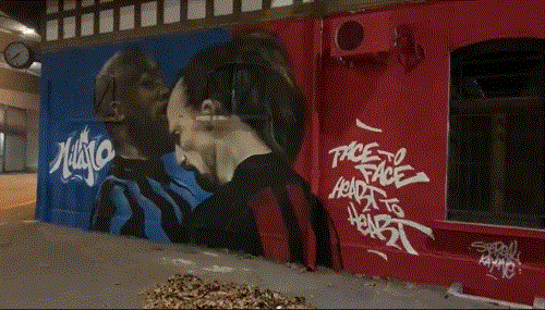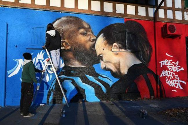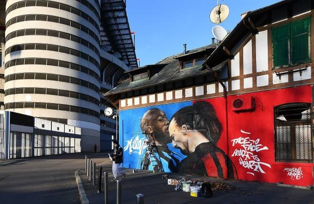 意大利杯米兰德比伊布与卢卡库恩怨未了,下周又将迎来意甲米兰德比,梅阿查球场旁边的建筑外立面惊现巨幅涂鸦,重现了伊布与卢卡库顶牛的镜头。