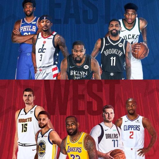 首发阵容这边,东西部分别由杜兰特和詹姆斯领衔。