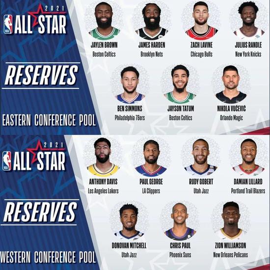 老样子几家欢喜几家愁,有人敲锣打鼓,有人遗憾落选。具体人员如下,分别由东西部15名教练投票产生: