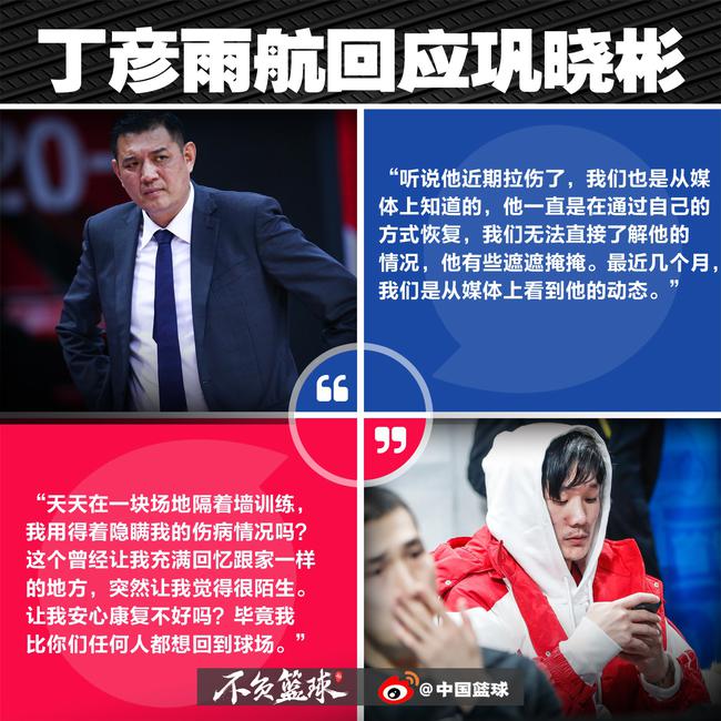北京时间2月26日,CBA第三阶段即将开打,而山东队球员丁彦雨航何时能够回归依旧是个未知数。近日,主帅巩晓彬在参加节目时表示对丁彦雨航的恢复并不知情,而小丁也在昨天深夜在微博上做了回应。