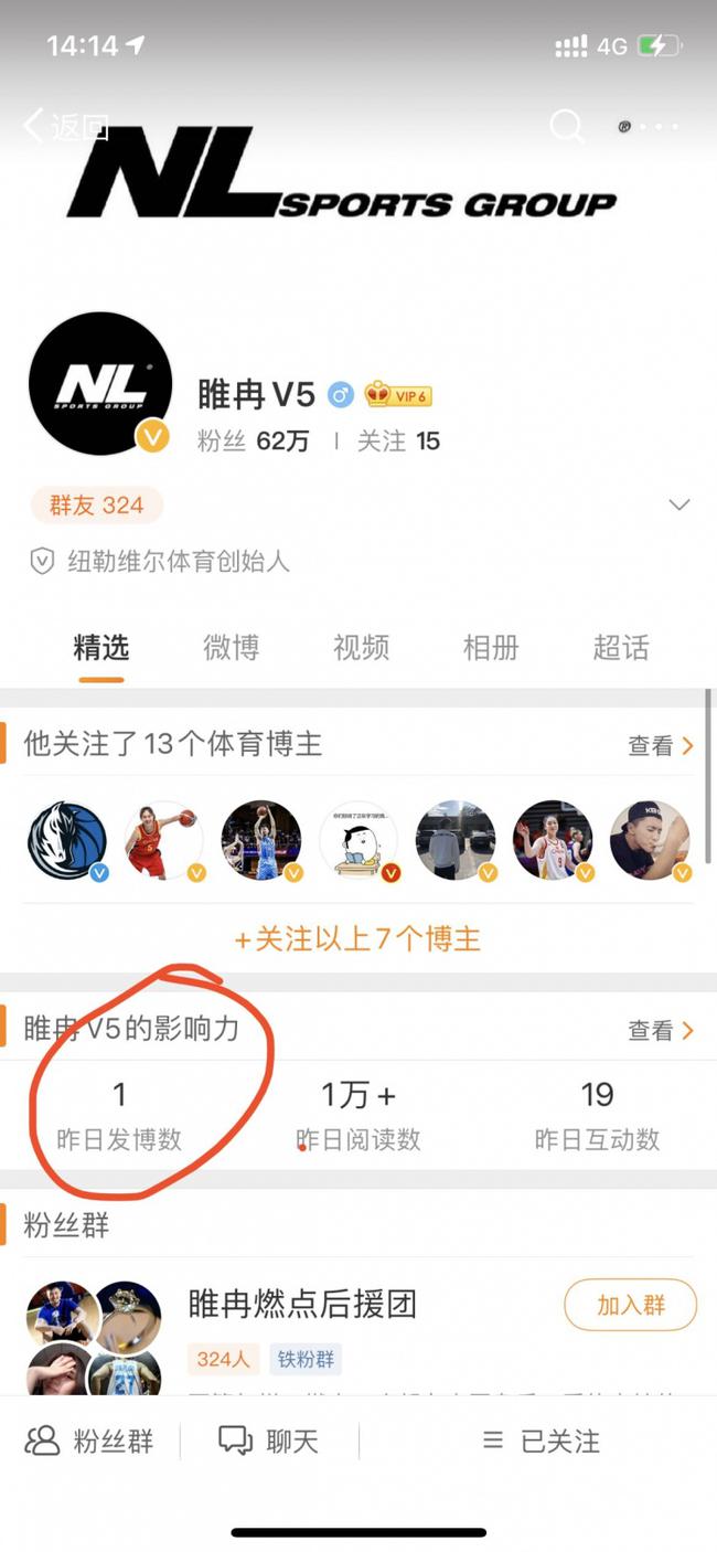 另外,根据微博记录显示,睢冉昨日发博数量为1(下图),但是他的微博列表中已经看不见该微博,由此可以确定的是他昨日有删除1条昨日发的微博。