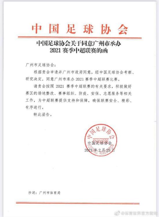 中国足协正式发函,同意广州市举办2021赛季中超联赛。