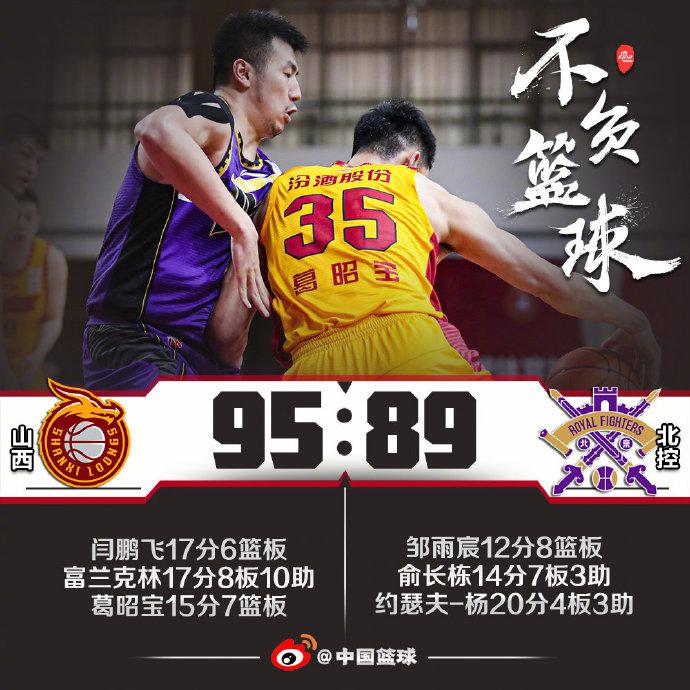 山西:富兰克林17分10助攻8篮板、闫鹏飞17分、葛昭宝15分、张宁13分、原帅12分、莫兰德8分。北控:约瑟夫-杨20分、俞长栋14分、张帆13分、邹雨宸12分8篮板、李根11分、王少杰10分、尤度5分、孙悦2分5助攻4盖帽。