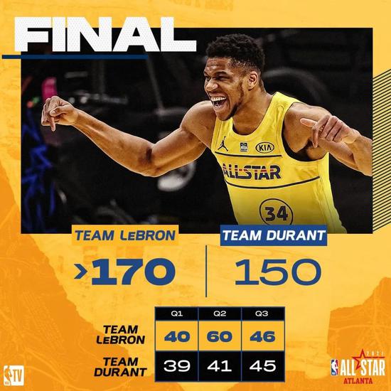 上半场詹姆斯队100-80领先杜兰特队。字母哥11投11中得到24分,库里三分8中6得到22分,利拉德得到16分,保罗6分6板12次助攻。