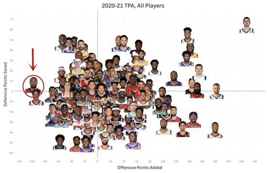 老实说,这样的进攻绝对谈不上出色,即便是对于塔克而言也有些过分凄凉,高阶数据上也能说明这一点——本赛季的TPA(总得分贡献)数据上,塔克的进攻排在联盟倒数第一,而且这已经持续了一段时间。