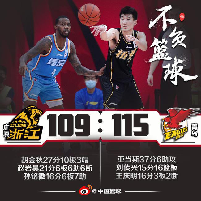 加时开打,还是许钟豪率先命中2分,赵岩昊罚球再添2分,胡金秋补篮得手,广厦一波6-0拉开差距。凭借王庆明、亚当斯的内外开花,青岛回敬一波9-3高潮,将比分扳成了108平。在比赛还有40秒,亚当斯连投带罚拿下3分,青岛3分优势打停广厦。关键时刻亚当斯两罚不中错失扩大优势机会。赵岩昊觅得3罚良机,可惜3罚中1。亚当斯两罚全中,张骋宇再添2分,青岛领先6分。最终,青岛115-109击败广厦。