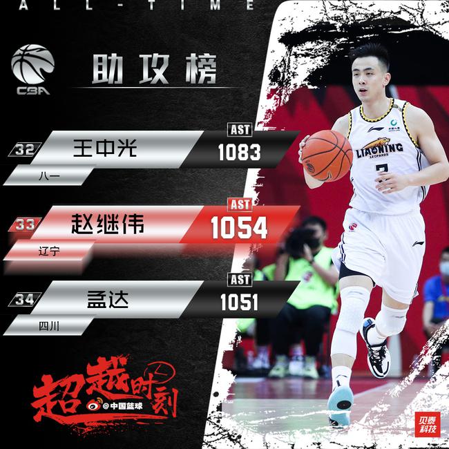 在今天送出8次助攻之后,赵继伟超越了孟达和达格里斯,独占CBA历史助攻榜第33位。
