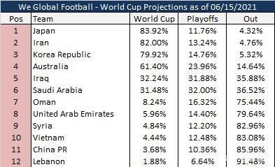 在12强赛的所有名单出炉之后,数据预测网站We Global Football给出亚洲12强赛球队晋级世界杯的概率。根据预测数据,国足在12强赛中突围、闯入2022卡塔尔世界杯的概率为3.68%,排名倒数第二。晋级世界杯概率最高的分别是日本、伊朗、韩国、澳大利亚和伊拉克。值得一提的是,国足在这一次的数据预测中,打进世界杯的概率甚至还不如越南,这也让很多球迷有些难以接受。