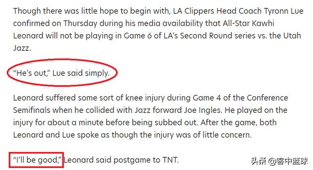 卢指导在接受采访时足够冷静,甚至可以说有点冷漠。但他并不是不关心莱昂纳德的伤势,只是正如他所言:“暂时没有进一步的消息(No update on Kawhi)。”况且快船队还有未竟的事业。