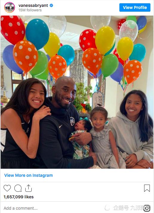 瓦妮莎分享了科比2019年的照片,当时他们的小女儿卡普里刚刚出生。照片里科比将卡普里抱在怀里,其余三个女儿娜塔莉亚、吉安娜和比安卡依偎在他身边。