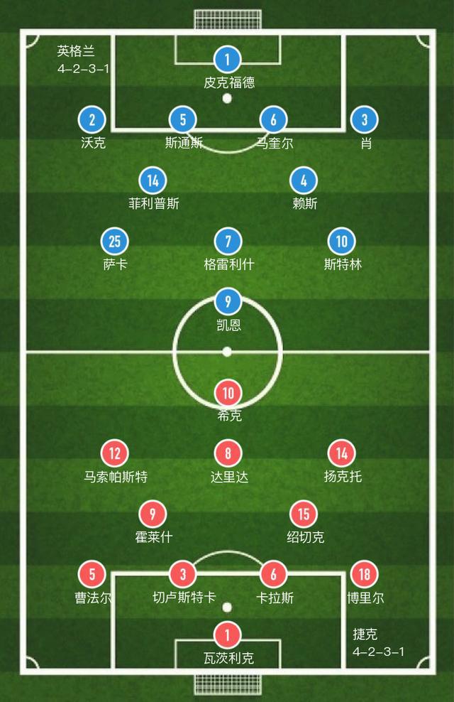 捷克(4-2-3-1):1-瓦茨利克,5-曹法尔,3-切卢斯特卡,6-卡拉斯,18-博里尔,9-霍莱什(84' 20-维德拉),15-绍切克,12-马索帕斯特(65' 19-赫洛泽克),8-达里达(65' 21-克拉尔),14-扬克托(46' 13-塞维克),10-希克(75' 24-佩克哈特)