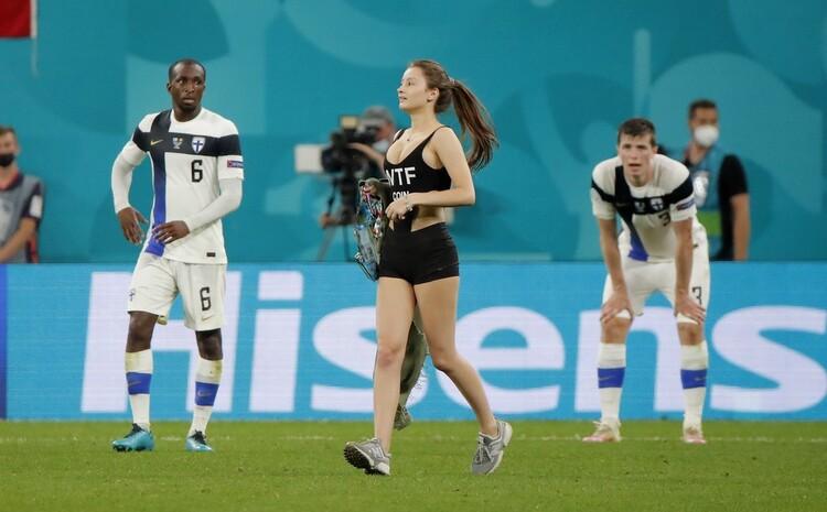 当地时间2021年6月21日,俄罗斯圣彼得堡,2020欧洲杯小组赛B组第3轮,芬兰VS比利时,比赛中一位女球迷冲入场内,球员看呆