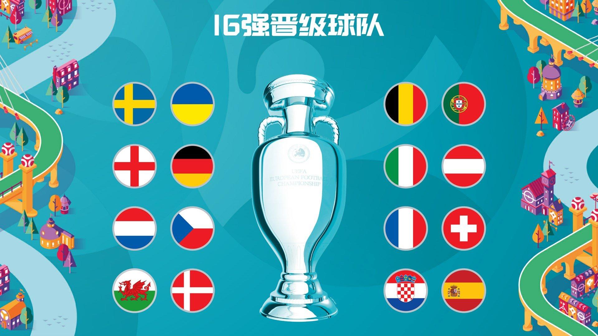 16支入围淘汰赛的球队分别是:A组意大利、威尔士、瑞士;B组比利时、丹麦;C组荷兰、奥地利、乌克兰;D组英格兰、克罗地亚、捷克;E组瑞典、西班牙;F组法国、德国、葡萄牙。