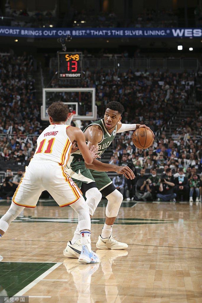 在一个回合中,特雷-杨错位防守字母哥,面对字母哥的背打,杨在对抗过程中竟然不落下风,他迫使字母哥后仰出手,球弹框而出。