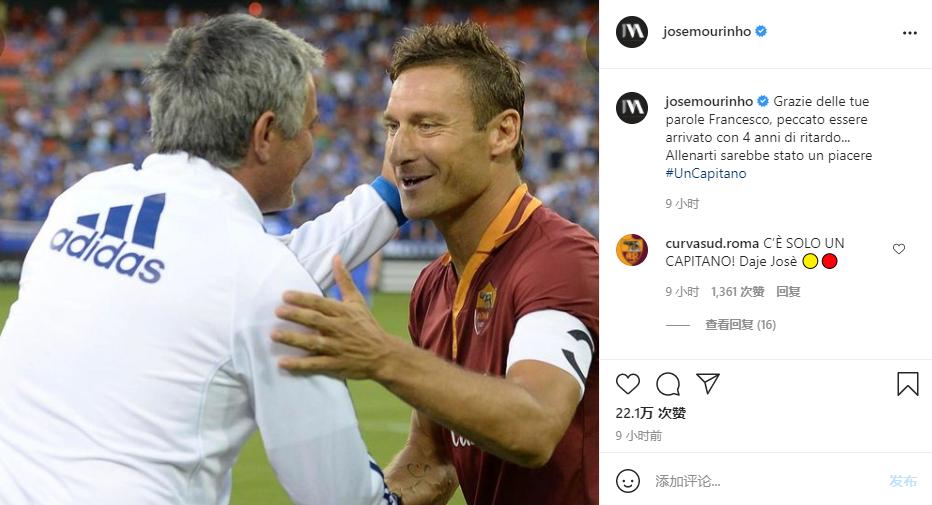 今天,穆里尼奥在Instagram上称赞了托蒂,并表示自己无法亲自执教托蒂是一种遗憾。