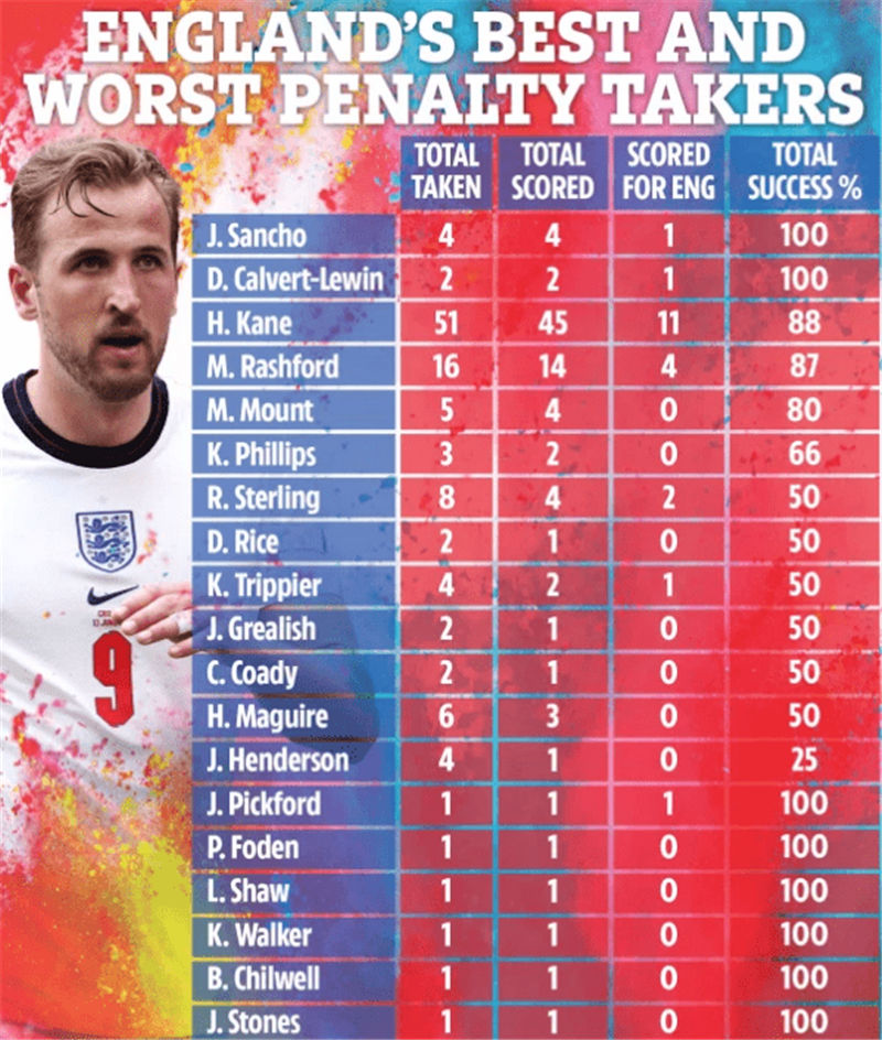 期待中的英德大战还未打响,但赛前关于这场比赛方方面面的消息已经覆盖到每一个角落。来自英国《太阳报》的报道,该媒体为英格兰主帅索斯盖特分忧,对三狮军团现有人员的罚点球情况进行了汇总,并罗列了他们的主罚成绩。