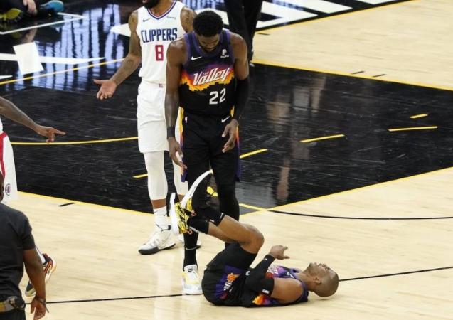 你也能看到保罗在一次三分打算造犯规的回合,慢镜回看贝弗利卡在了保罗跳起后悬空的双腿下,后者下落时直接失去平衡尾骨部重重砸在了地上。