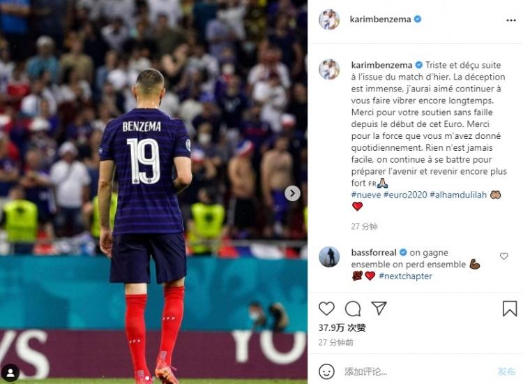 本泽马写到:“对昨天比赛的结果感到伤心和失望。巨大的失落,本希望能够让大家激动、兴奋很长时间。感谢大家自欧洲杯开赛以来一直的支持,谢谢每天带给我无限力量。没有什么是容易的,我们会继续战斗为未来做准备,更强大地回来。”