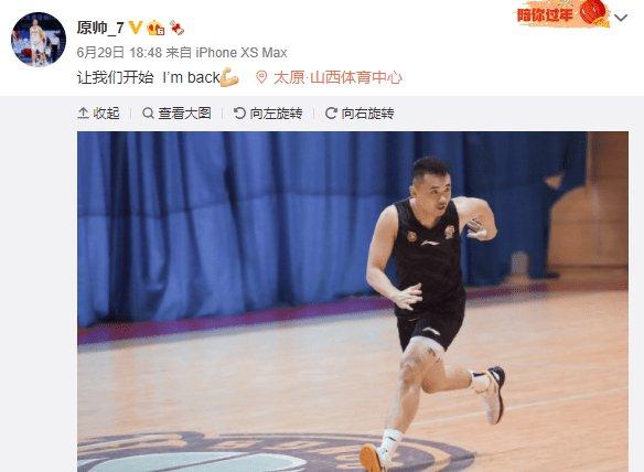 “让我们开始 I’m back!”昨天晚上,原帅在微博上宣布自己已经与山西队续约,并晒出了一张在山西体育中心训练的照片。
