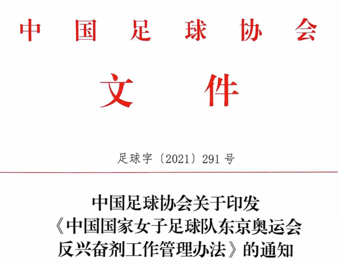 扬子晚报网6月29日讯(记者张晨瑆孙云岳张昊)北京时间6月28日,中国足协官方发布《中国国家女子足球队东京奥运会反兴奋剂工作管理办法》。在《办法》总则中写道:“为防止中国国家女子足球队在第32届奥运会参赛期间发生兴奋剂违规事件,规范相关反兴奋剂工作的具体实施,根据国务院《反兴奋剂条例》、国家体育总局《反兴奋剂管理办法》和2021版《反兴奋剂规则》,参照国际奥委会《第32届奥运会反兴奋剂规则》、《2020东京奥运会与残奥会兴奋剂管制指南》及有关国际标准,制定本管理办法。”