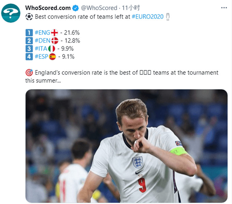 4、进球转化率:英格兰21。6%,丹麦12。8%,意大利9。9%,西班牙9。1%