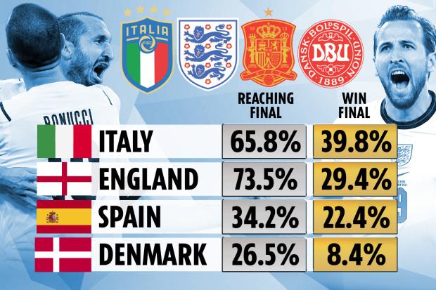 尽管英格兰在罗马取得了一场令人信服的4-0大胜,但他们却并非夺冠最大热门。日前,StatsPerform网站的超级电脑基于四强各项数据对半决赛和决赛进行了预测,意大利成为了最大热门。