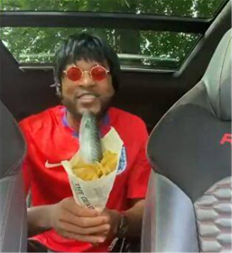 埃弗拉在自己的社交媒体上发布了一段视频,其身穿英格兰球服,手里捧着薯条和死鱼,戴着红色墨镜,在车内为英格兰加油,其边说边唱道:“上次英格兰夺冠,恐龙都还活着呢,加油英格兰,你们能做到的。”说着说着激动地将手里的薯条和鱼散落在车里。