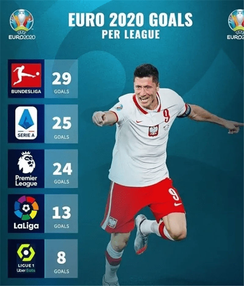 2020欧洲杯进入尾声。在总共51场比赛里,已经进行了49场,仅剩下一场半决赛和最后的决赛。在已经进行的49场比赛里,一共打进了137球。据统计,这137球基本由效力五大联赛的球员包揽(101球)。其中,德甲29球、意甲27球、英超24球、西甲13球、法甲8球。