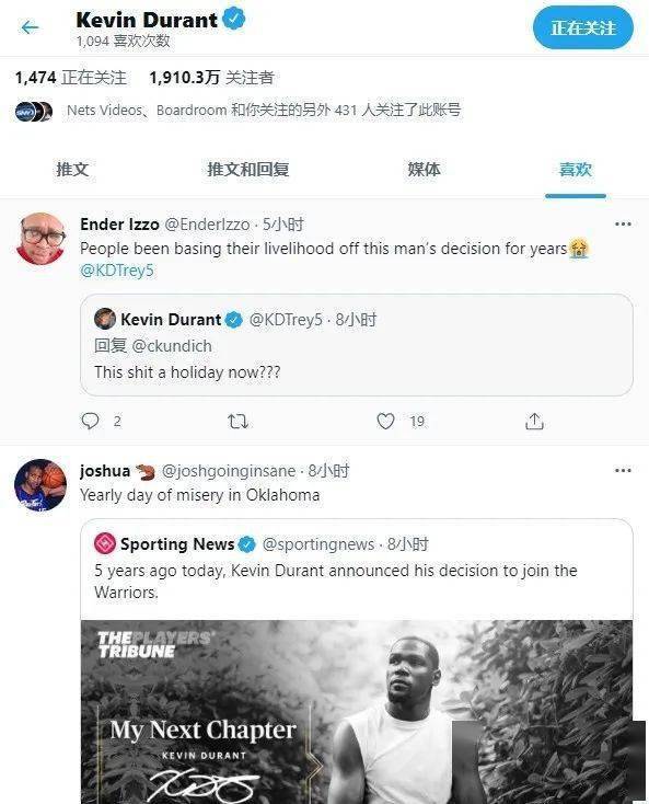 然后,今天Sporting News发了杜兰特加盟勇士5周年的报道,一网友转发并@杜兰特:不少人时至今日还会因此而大声痛哭,干得漂亮@KDTrey5。