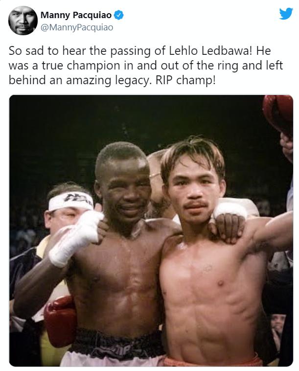 曾与莱德巴瓦交手过的帕奎奥在社交媒体上对这位曾经的对手进行了哀悼。“很伤心听到莱德巴瓦去世的消息,在拳击台内外他都是真正的冠军,并留下了惊人的遗产,R.I.P,冠军!”