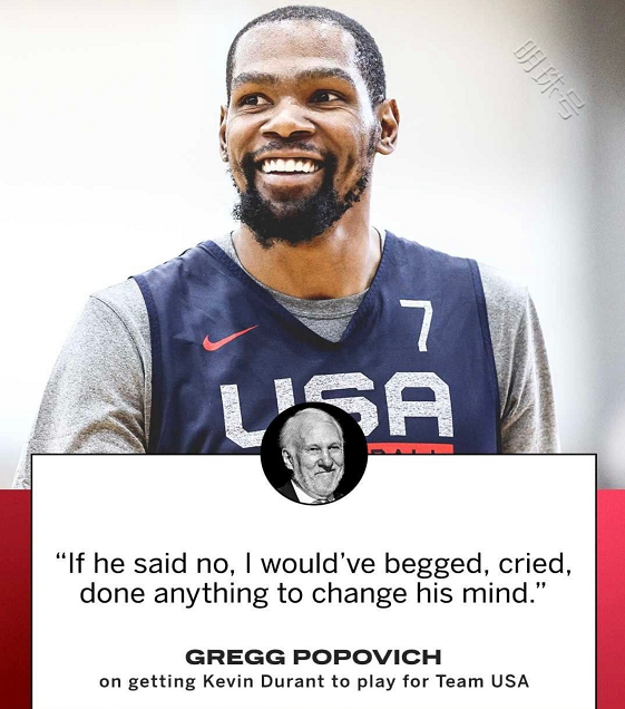 美国男篮主帅波波维奇在接受的时候表示:“如果杜兰特说不参加奥运会的话,我会去求,会去哭,会竭尽所能,去请杜兰特参加这次的奥运会。”