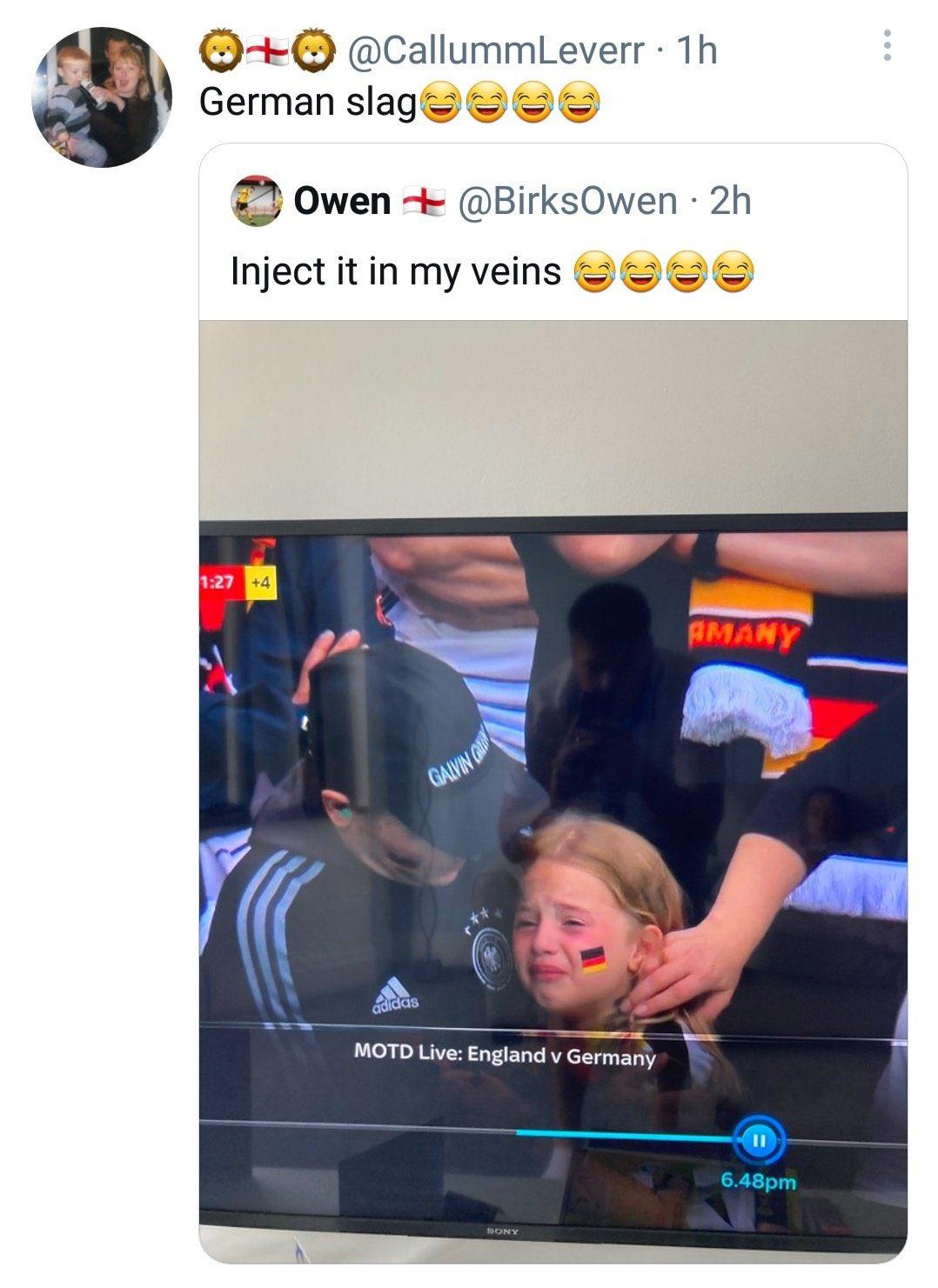 根据社交网站上的截图显示,许多英国球迷用各种极尽侮辱性的语言,对这位哭泣的德国小球迷实施网络暴力,包括用“纳粹渣滓”和其他侮辱性称呼来骂她。其中一位推特用户说,“哭吧,你这个小纳粹。”还有人说:“我很抱歉,但我嘲笑了德国女孩的哭声......(实在)忍不住,我没有同情心,是一个60岁的不成熟的英格兰球迷。我现在有机会反思这种行为,但可悲的是现在还在笑。”一名英国网红杰克·卡尔·迪恩 (Jack Carl Dean)则写道:“在看到一个 10 岁的德国小女孩在人群中哭泣后,我听到了酒吧人群爆发出欢呼声,这是我这辈子最为自己是英国人而感到自豪的事。”