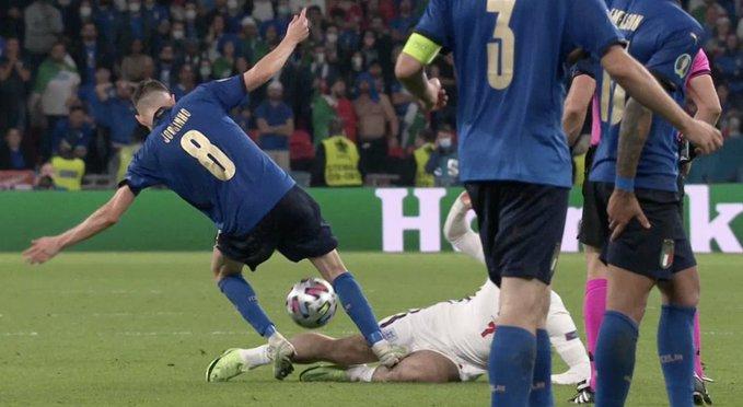 我们一起来看一下这个犯规过程。加时赛,第112分钟,英格兰进攻被破坏,随后格拉利什和若日尼奥都去抢球。格拉利什用一个滑铲,先碰到了球,而若日尼奥没有收腿,他的脚先是踩在了球上。由于皮球太滑,若日尼奥的脚随后直接重重地踩在了格拉利什的膝盖上。